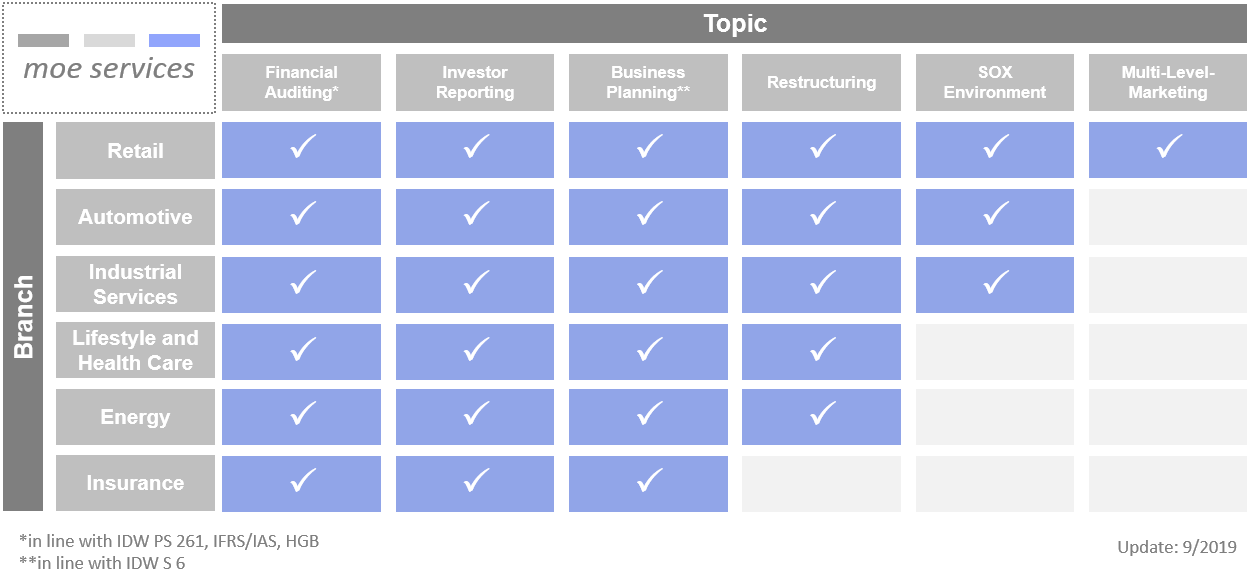 moe-services.com bietet einschlägige Expertise aus der Wirtschaftsprüfung und der Management Beratung, sowie flexible Interims-Lösungen für handelsrechtlich prüfungspflichtige und/oder kapitalmarktorientierte Unternehmen an.